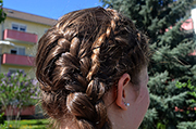 Wer nach ein paar französisch-reingeflochtenen Strähnen keine Lust mehr hat, kann diese Variante wählen. Wenn man an jeder Schläfe jeweils eine Haarpartie abgetrennt hat, muss nämlich nur ein kurzer Teil davon angeflochten werden. Der Rest wird einfach normal bis zum Ende geflochten und schließlich mit Haarnadeln rings um den Kopf angesteckt.