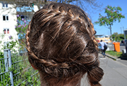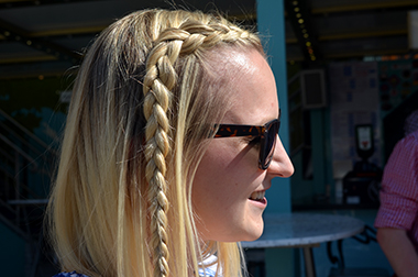 „Das hab ich eben nur kurz gemacht“, sagt uns diese junge Dame, als wir ein Foto von ihrer Frisur machen wollen. Wer also nicht viel Zeit hat, keinen Spiegel und auch keine Hilfe von anderen, der ist mit einem seitlichen Flechtzopf immer gut beraten.