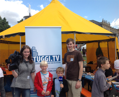 Und STUGGI.TV war im knallgelben Zelt mit Medien-Stand mittendrin dabei. Kinder von sechs bis zwölf Jahren durfen bei uns einen Original-STUGGI.TV Beitrag produzieren. Wir haben also sozusagen unverbindlich unsere potenziellen neuen Moderatoren gecastet. Die haben dann sowas wie „Mein Bruder tut jetzt Bobbycar fahren“ ins Mikro gesagt.
