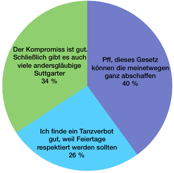 Das Ergebnis ist diesmal eindeutig. Die Mehrheit findet es gut, dass das Tanzverbot gelockert wurde. 34% der Stimmen bewerten die Entscheidung als sehr gerecht, weil nicht für jeden die religiösen Feiertage von Bedeutung sind. Ganze 40% würden das Tanzverbot sogar ausnahmslos abschaffen. Immerhin ein Viertel von euch ist noch Befürworter von dem Gesetz und bedauert, dass es nun für so viele Feiertage aufgehoben wurde.