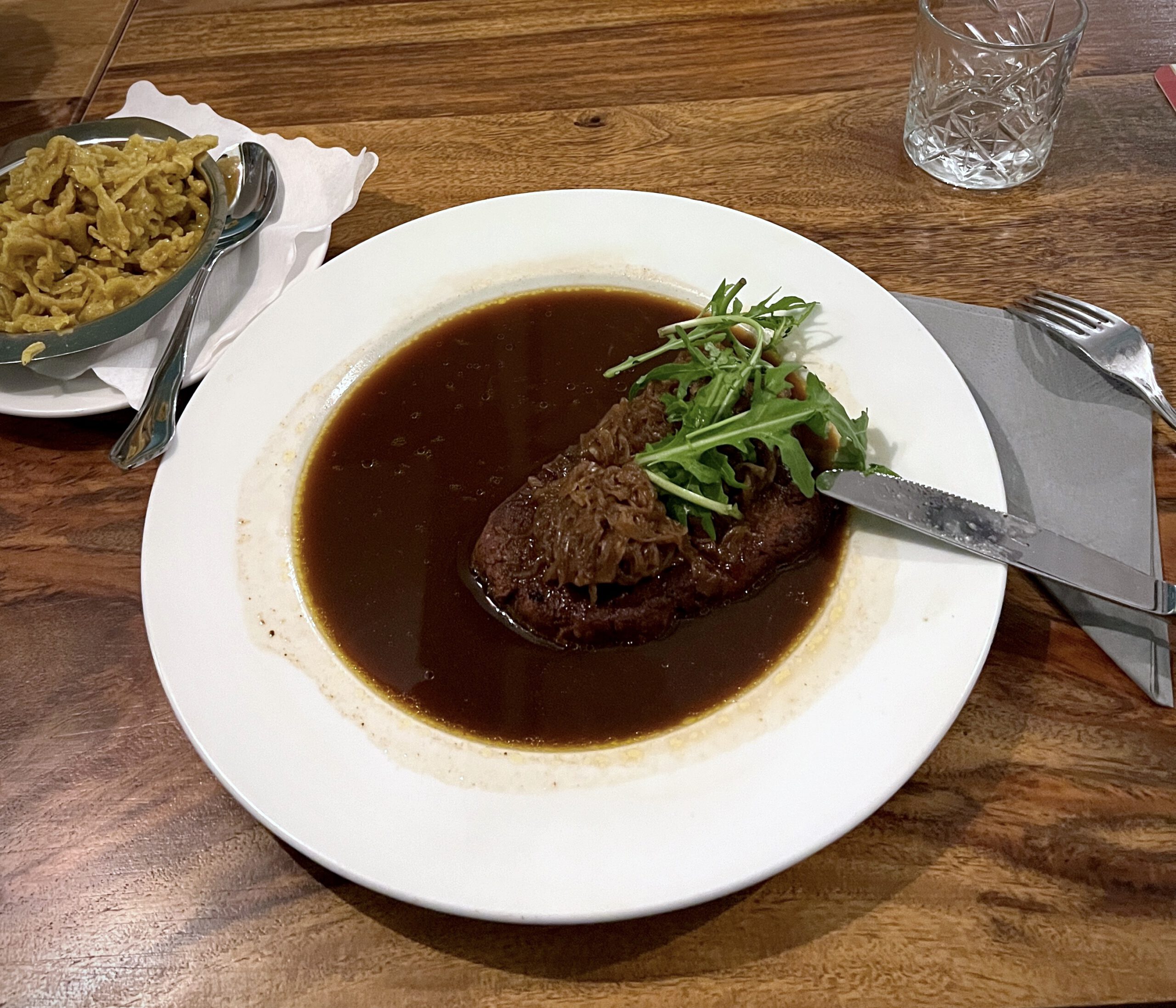 Zugegeben, der letzte „echte“ Rostbraten ist bei uns schon ein paar Jahre her. Gerade deshalb waren wir neugierig: Kommen die veganen Interpretationen ran an das, was wir aus unserer Kindheit kennen? Optisch stehen die Gerichte dem Original jedenfalls in nichts nach. Der Rostbraten und das Geschnetzelte „Stroganoff“-Art mit Spätzle haben uns auch geschmacklich überzeugt. Zwar schmeckt man vor allem anhand der weicheren Konsistenz, dass es sich nicht um echtes Fleisch handelt, doch die Gerichte treffen den Geschmack der Originale wirklich erstaunlich gut. Die handgemachten Knöpfles-Spätzle sind weich und sehen nicht nur genau so aus, sondern schmecken auch genau wie das Original. Der vegane Zwiebelrostbraten ist perfekt herzhaft gewürzt, hatte für unseren Geschmack aber ein bisschen zu wenig Bissfestigkeit. Was den schwäbischen Geschmacksnerv jedoch zu 100 Prozent trifft, ist das „Trollingersößle“ in Kombination mit den Spätzle. Geht halt nichts über Spätzle mit Soß‘. Man schmeckt, das hier viel Hingabe und Liebe in die Gerichte fließt. So auch beim Nachtisch: Eine herrlich cremige heiße Schokolade mit Hafermlich und pflanzlicher Spühsahne.