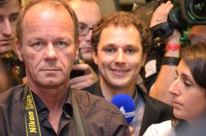 19:09 – Wer die „Ellenbogen-Technik“ drauf hat, ist von Vorteil. David hat sich im Gedränge um einen guten Platz durchgekämpft. Seine Medienkollegen sind davon „schwer begeistert“.