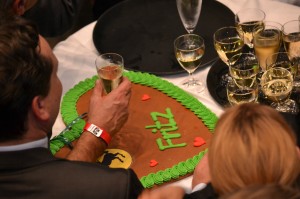 19:40 – Die Grünen feiern mit Sekt und Kuchen ausgelassen Fritz Kuhns Sieg.