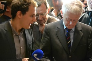 19:18 – Soeben ist Fritz Kuhn, begleitet von Ministerpräsident Winfried Kretschmann, reingekommen – gefolgt von einem riesigen Medienauflauf. Während die Medienvertreter um ein Statement kämpfen, lässt sich Kuhn von den Grünen feiern.
