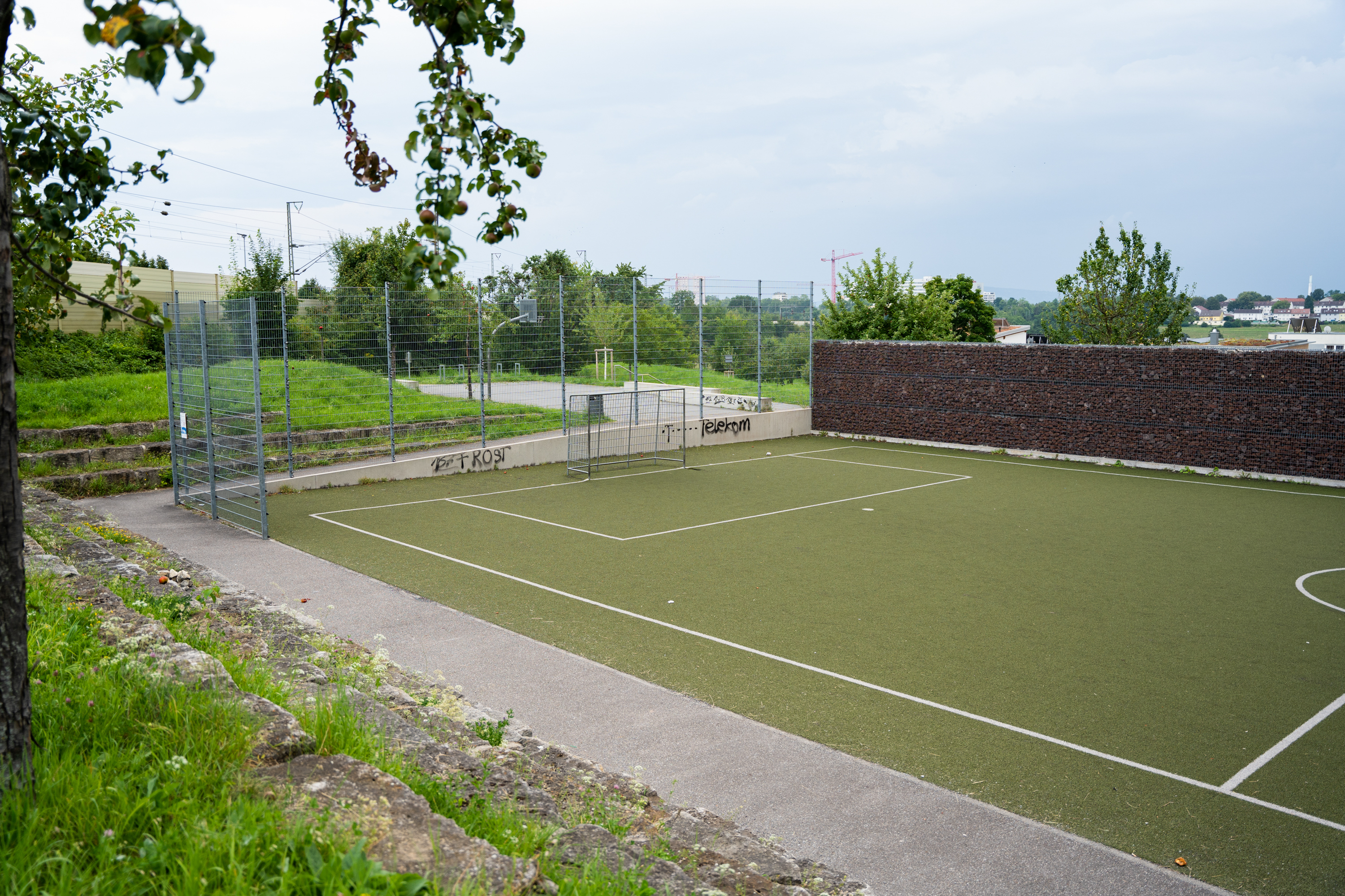 Vorteil: Der grüne Kunstrasen hat eine Top-Qualität, die Spiellinien sind klar erkennbar. Die Tore sind fest installiert. Der Bolzplatz ist auf drei Seiten eingegrenzt, die häufige Ballsuche reduziert sich damit erheblich. Für eventuelle Zuschauer gibt es eine Steintribüne.