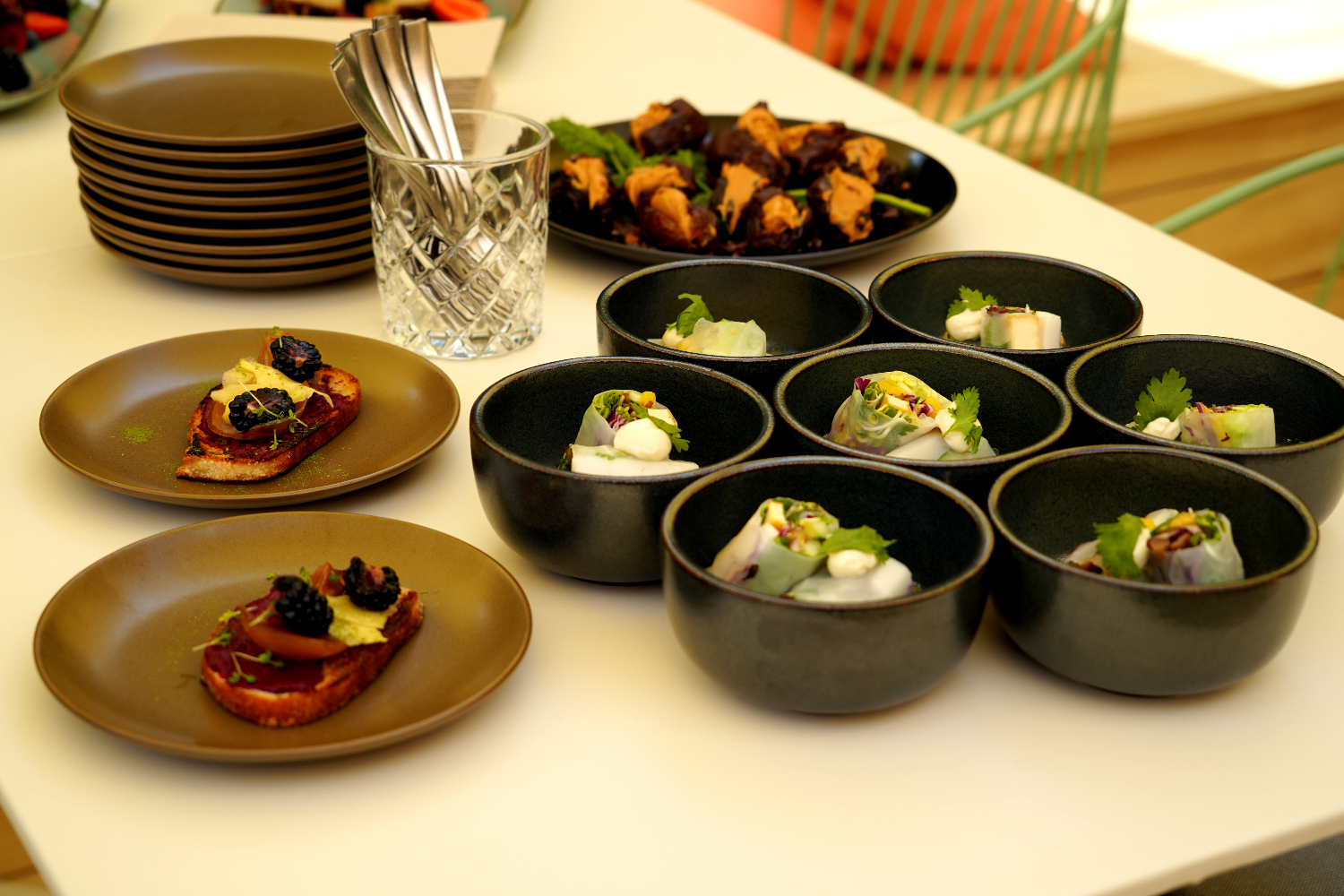 Im Vorhinein war noch nicht die ganze Karte bestellbar. Für uns gab es Sommerrollen, vollgepackt mit Gemüse und Salat, kross gebratenes Baguette mit Rote-Bete-Creme, Balsamicozwiebel und Brombeereat sowie Bananenbrot mit Nüssen und Früchten. Und auch als Nicht-Veganer muss ich sagen: Ich hatte mehrere „Wow-Momente“. Das Spiel mit den verschiedenen Geschmacksrichtungen geht voll auf, die Kreationen sind wunderbar abgeschmeckt. Man freut sich tatsächlich schon auf den nächsten Bissen und ist gespannt, wie die verschiedenen Zutaten miteinander funktionieren.
