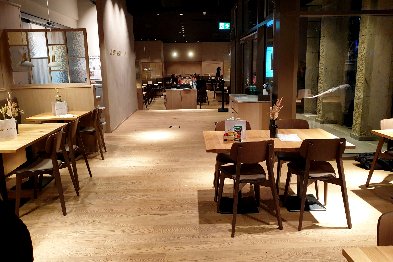 Betrachtet man das Lautenschlager von außen, fällt einem als erstes die große Empore ins Auge. Von diesem „Prunkstück“ hat man in den Sommermonaten einen schönen Blick Richtung Palast der Republik und Theodor-Heuss-Straße. Der Innenraum ist weitläufig, hell und modern gestaltet. Für unseren Geschmack allerdings etwas zu schlicht: An den Wänden gibt es keine Bilder, auch etwas frische Begrünung oder Deko-Elemente sucht man vergeblich.