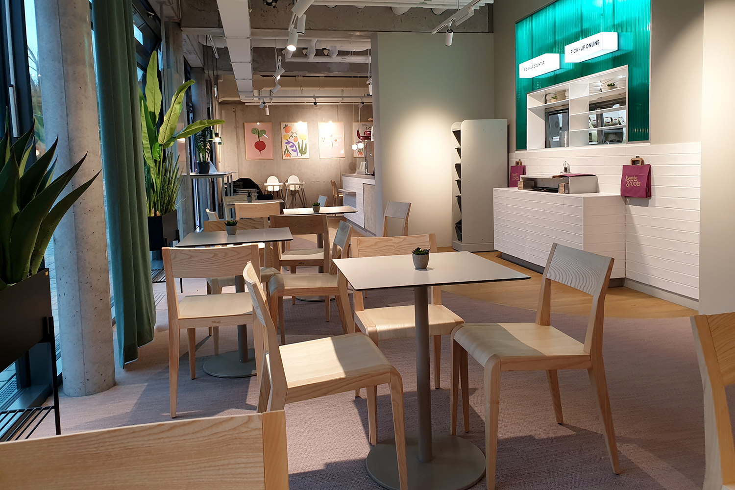 Von außen ist das Beets and Roots nicht sehr auffällig. Ein Schriftzug und eine große Glasfront befinden sich links und rechts des Eingangs. Im Inneren steht man dann quasi direkt an der Theke und kann seine Bestellung aufgeben. Den Platz kann man sich selbst aussuchen. Es stehen mehrere kleine und um die Ecke auch ein paar größere Tische zur Verfügung. Um die kleinen Tische stehen drei Stühle, was das ganze etwas beengt aussehen lässt. Ein paar Pflanzen sorgen für einen kleinen Sichtschutz vor den Blicken draußen. Außerdem schmücken einige Bilder die schlichte Betonwand, ansonsten kommt das Lokal ohne viel Schnickschnack aus. Die Möbel bestehen fast ausschließlich aus Holz. Hintergrundmusik füllt den sonst recht ruhigen Raum.
