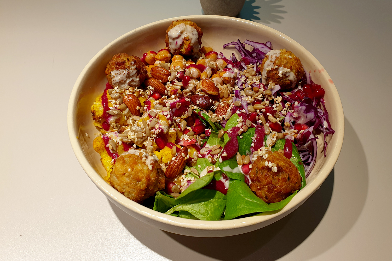 Die „New Oriental Bowl“ im Beets & Roots. Optisches Highlight sind die roten Granatapfelkerne.