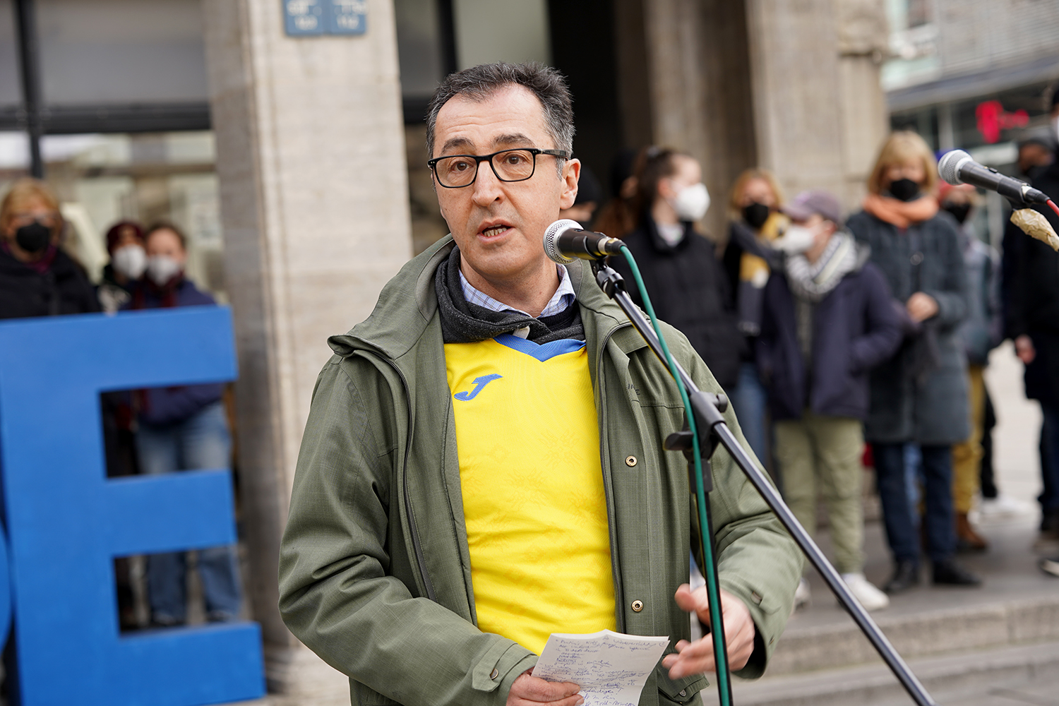Am Sonntagnachmittag fanden rund 400 Menschen ihren Weg auf den Schlossplatz, um gemeinsam ihre Solidarität für die Ukraine zu bekunden und gegen die Angriffe Russlands zu demonstrieren. Aufgerufen zur Kundgebung hatte die Initiative "Pulse of Europe". Zu Wort meldeten sich Bundesminister Cem Özdemir sowie drei Ukrainerinnen.