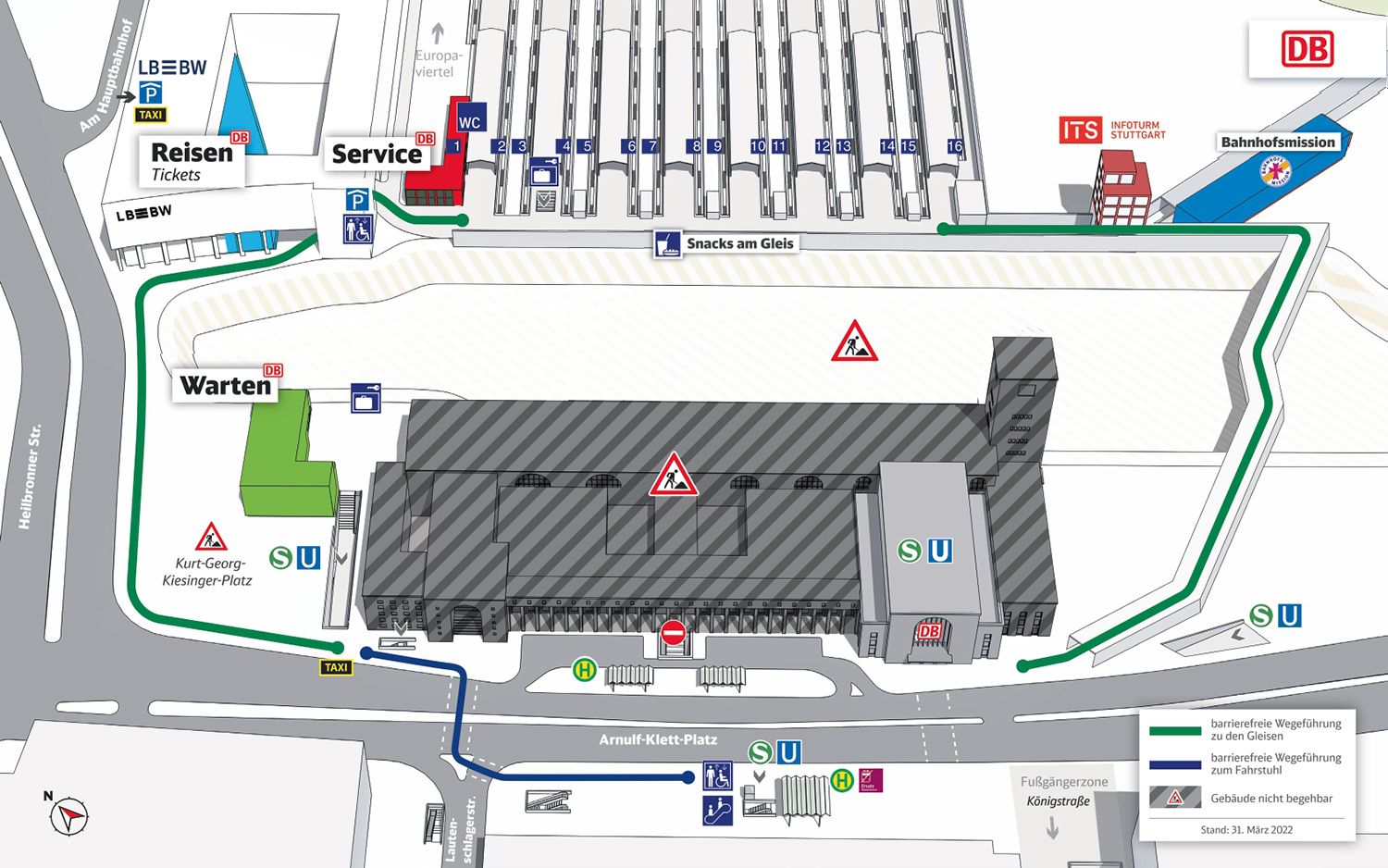 Die Wege werden länger: Bahnfahrer müssen sich am Hauptbahnhof Stuttgart auf eine neue Wegführung einstellen. Ab Donnerstag, 31.3. ist der Zugang zu den Gleisen durch den Bonatzbau gesperrt. Stattdessen muss man außen um das Gebäude herum. Der Weg links vorbei über die Heilbronner Straße war bisher schon möglich. Auf der rechten Seite wurde nun ein neuer Steg installiert, der zu den Gleisen führt. Die Entscheidung, welchen Weg man nimmt, sollte man je nach Gleis treffen (siehe Grafik unten).