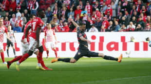 55. Min. Beinahe rächt es sich. Eine Mainzer Ecke köpft Kohr an den Innenpfosten, Müller schnappt sich den Ball, bevor er komplett die Linie überquert.