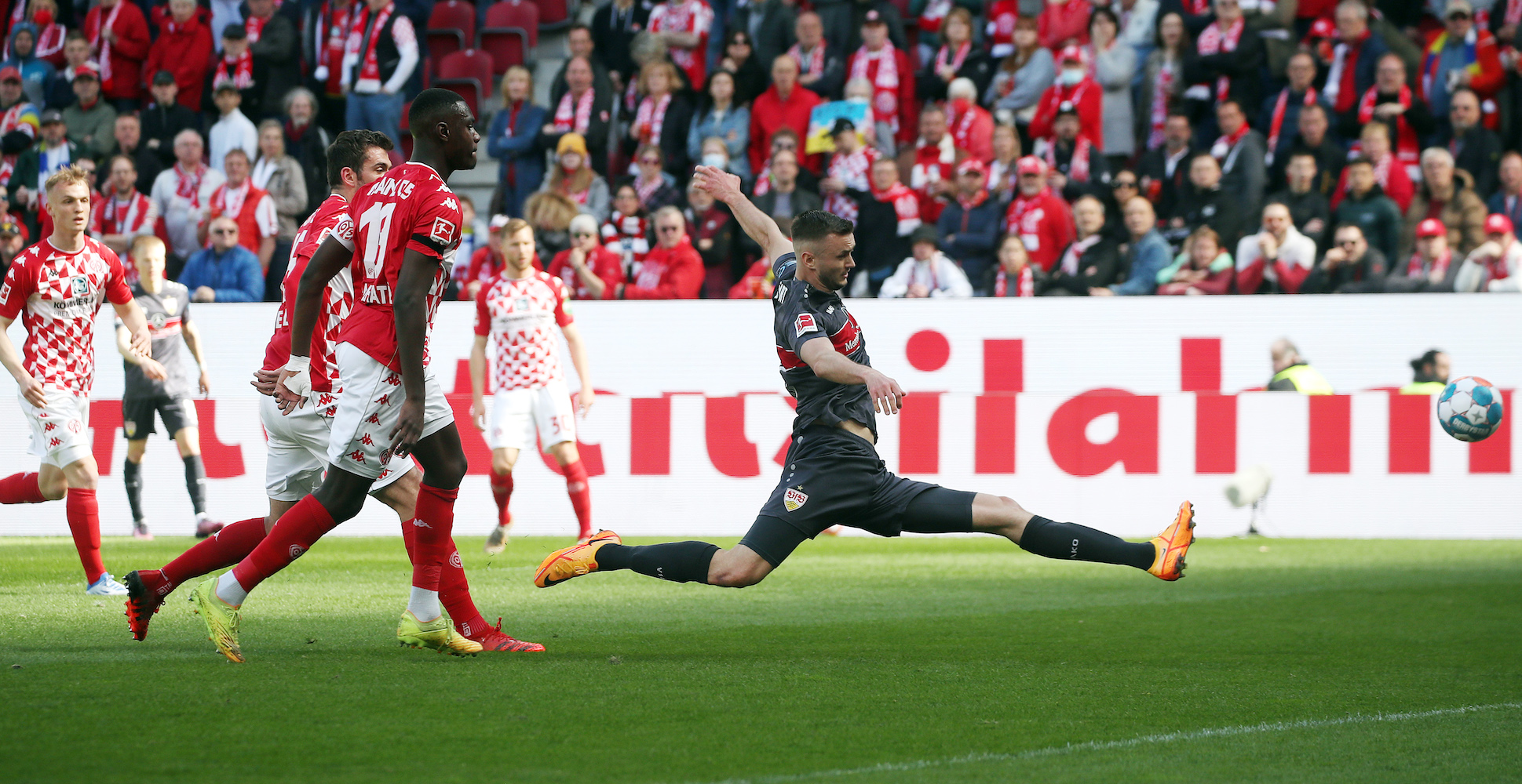 51. Min. Harakiri-Aktion von Zentner: Nach einem langen Ball von Mavropanos kommt der Mainzer Keeper weit aus seinem Kasten. Bei seinem Klärungsversuch per Kopf räumt er seinen eigenen Verteidiger ab, die Kugel landet direkt bei Führich. Der zieht aus knapp 30 Metern direkt ab, verfehlt das leere Tor aber um einige Meter. Der VfB lässt hier wieder viel liegen.