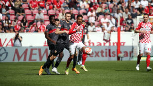 33. Min. Jetzt mal eine Chance für die Mainzer? Langer Pass auf Onisiwo, der im Laufduell mit Mavropanos eher am Ball ist. Die Hereingabe auf den eingelaufenen Burkardt kann der VfB-Verteidiger aber abblocken.