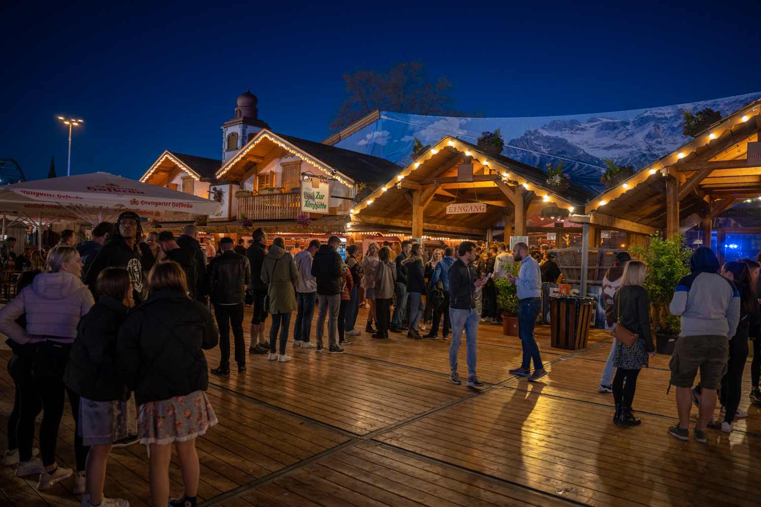 Guter Starttag für das Stuttgarter Frühlingsfest light: Trotz des abgespeckten Angebots kam es am Samstagabend zeitweise zu großem Besucherandrang. Auf dem Veranstaltungsgelände war ein Durchkommen in einigen Gassen nur schwer möglich. Vor den Fahrgeschäften und dem kleinen Festzelt im Almhüttendorf bildeten sich Schlangen. Wir haben die Fotos vom ersten Abend auf dem Frühlingsfest light.