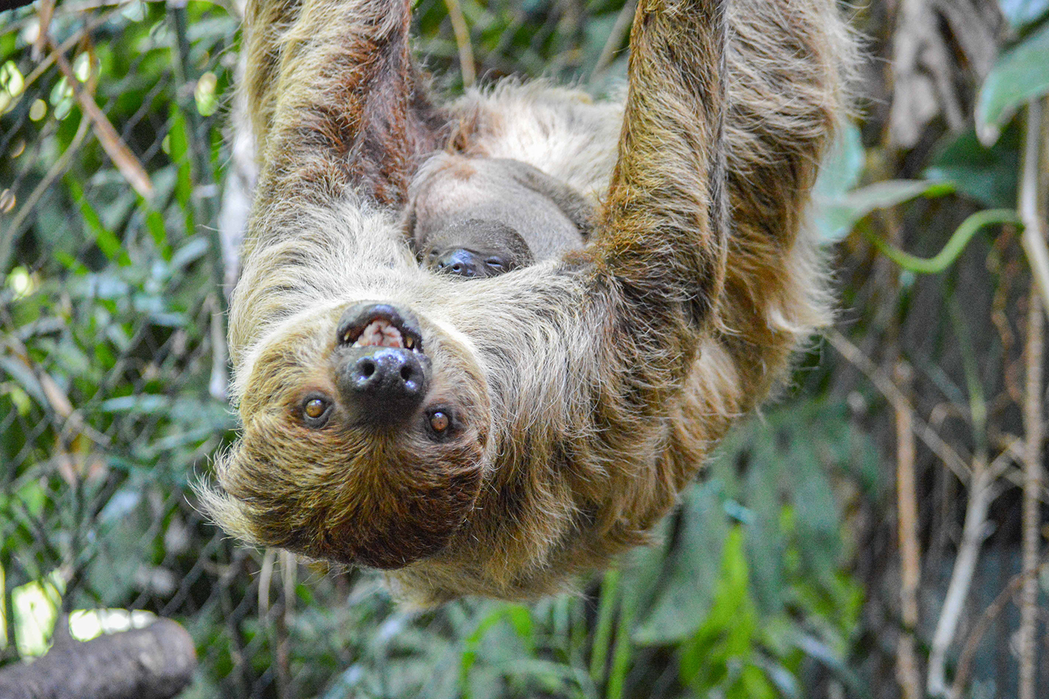Die beiden Baby-Faultiere krallen sich kopfüber im Fell ihrer Mutter fest. Solange die Jungtiere noch so klein sind, entdecken sie die Welt erst einmal so. Faultiere werden erst mit neun bis zwölf Monaten selbstständig. Trotzdem zeigen sie schon Interesse am Futter der erwachsenen Tiere. Besonders Kartoffeln gehören zum Lieblingsessen der Faultiere. Aber auch Obst und Gemüse stehen auf der Speisekarte. Gemeinsam mit ihren Müttern zupfen sie Laub von den Ästen, die ihnen die Tierpfleger reichen. Für die 21-jährige Marlies ist es bereits das fünfzehnte Baby, für ihre achtjährige Tochter Edeka das dritte. Faultiere haben keinen an den Jahreszeiten orientierten Zyklus und können so das ganze Jahr Nachwuchs bekommen. „Eine umso freudigere Überraschung ist also der zeitgleiche Kindersegen“, heißt es in der Pressemitteilung der Wilhelma.