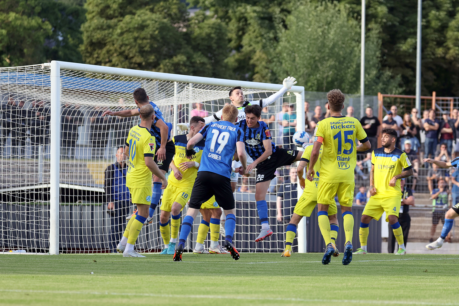 15. Min. Trier zeigt sich zweimal gefährlich: Zunächst kann Castellucci aus kurzer Distanz klären, die anschließende Ecke begräbt der Kickers-Keeper unter sich.