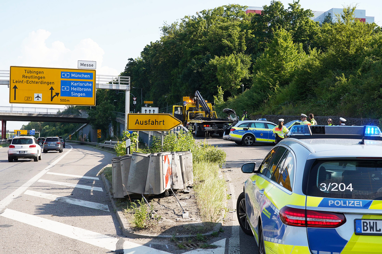 Ein Totalschaden und drei Verletzte: Am Dienstag, 21.6., geriet ein Polizeiauto in einen schweren Verkehrsunfall auf der B27. Zwei Polizisten und eine Auszubildende saßen in dem Streifenwagen. Die Polizisten hatten ein Auto verfolgt, das sich einer Kontrolle entzogen hatte. Wie die Polizei mitteilte, habe der Wagen plötzlich gewendet und sei über die B27 geflohen. Die Beamten nahmen daraufhin mit Blaulicht und Martinshorn die Verfolgung auf. Das flüchtende Fahrzeug fuhr an der Ausfahrt Fasanenhof von der B27 ab. Beim Versuch, ihm zu folgen, kam der Streifenwagen von der Fahrbahn ab und rammte einen Fahrbahnteiler.