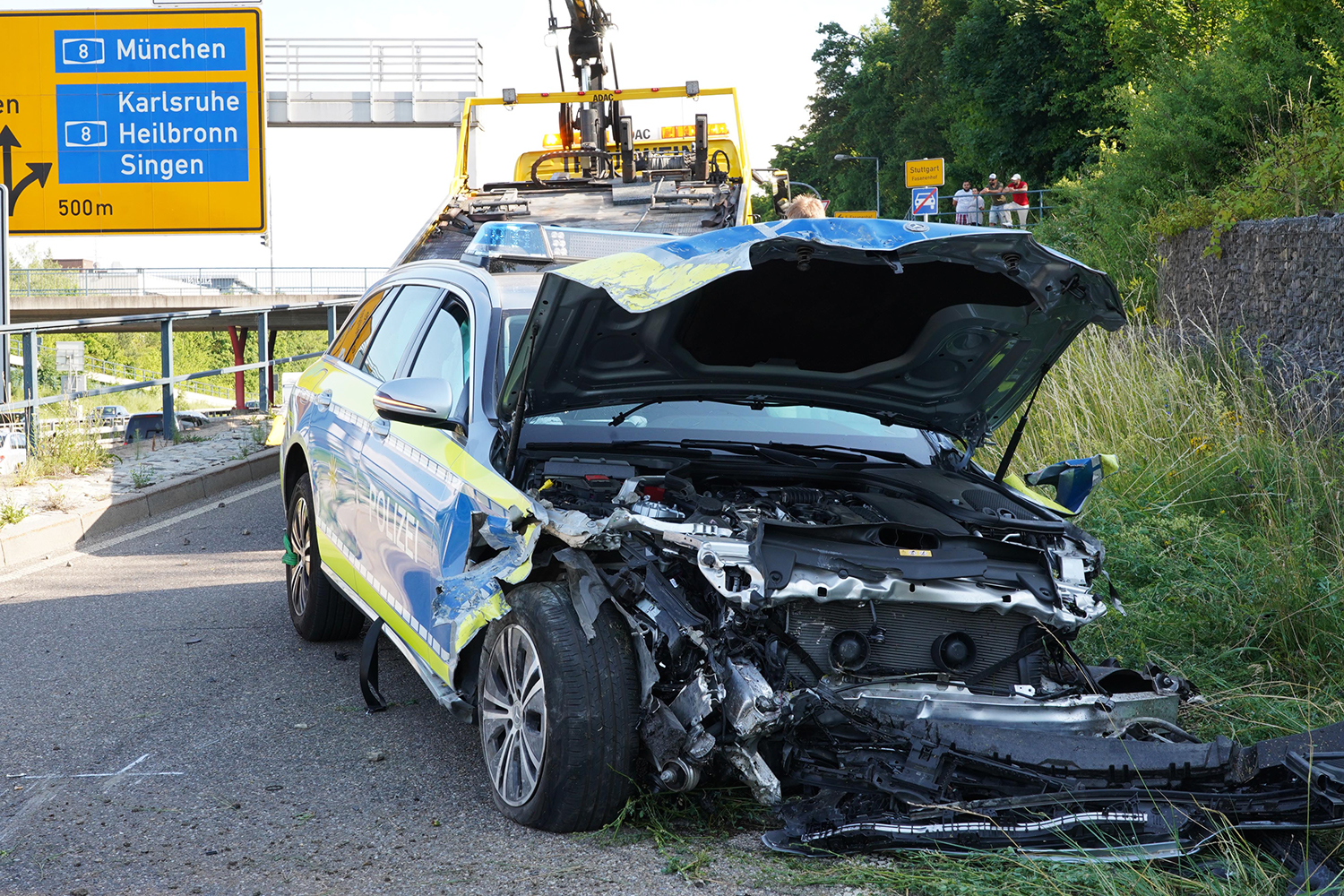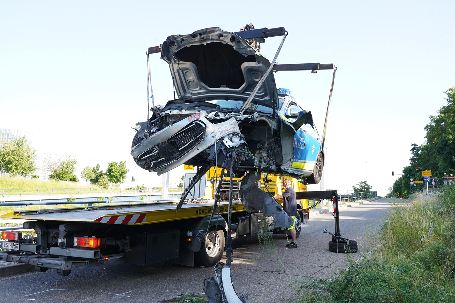 Der 30-jährige Fahrer und der 50-jährige Beifahrer wurden schwer verletzt ins Krankenhaus gebracht. Die 21-jährige Auszubildende hatte mehr Glück. Sie wurde nur leicht verletzt und konnte das Krankenhaus nach einer ambulanten Behandlung wieder verlassen. Am Streifenwagen entstand ein Totalschaden in Höhe von etwa 60.000 Euro. Der Schaden an den Verkehrseinrichtungen und der Fahrbahn wird auf weitere 25.000 Euro geschätzt.