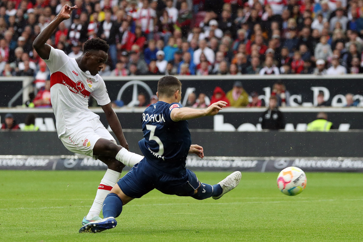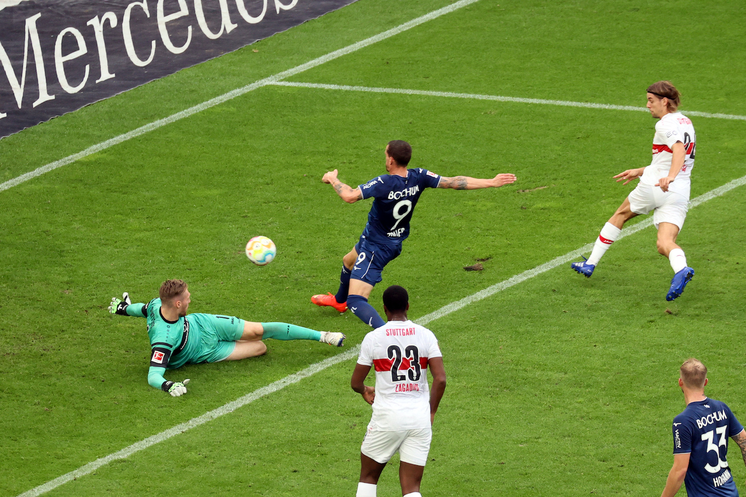 22. Min. TOR FÜR STUTTGART! Die Bochumer Defensive ist unsortiert, Riemann kommt bei einem langen Ball aus seinem Kasten. Silas spielt überlegt zu Ahamada, der aus 11 Metern überlegt einnetzt.
